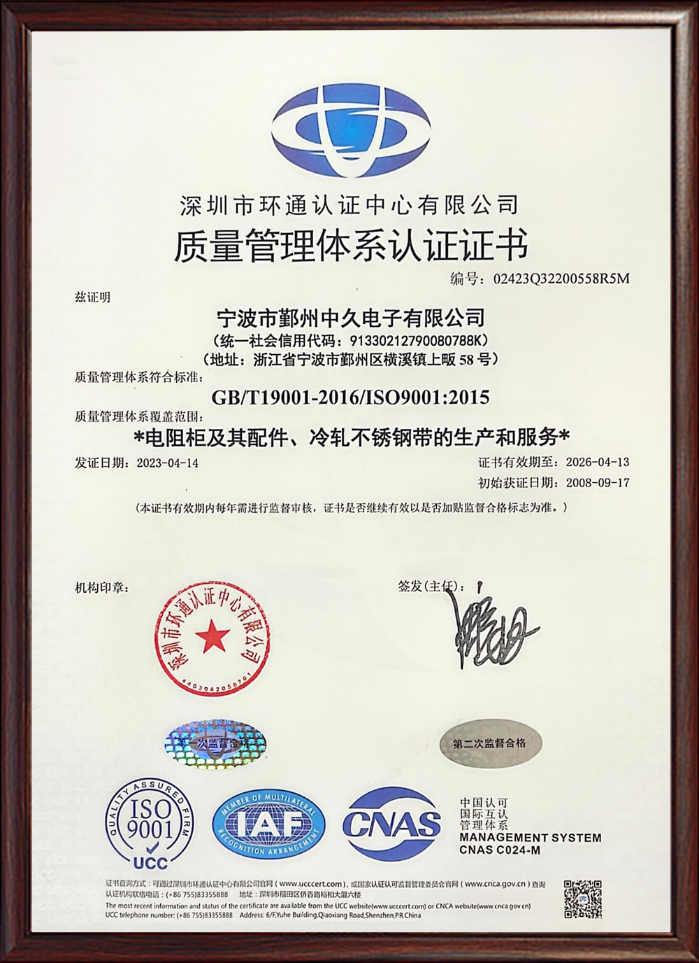 ISO质量管理体系认证证书